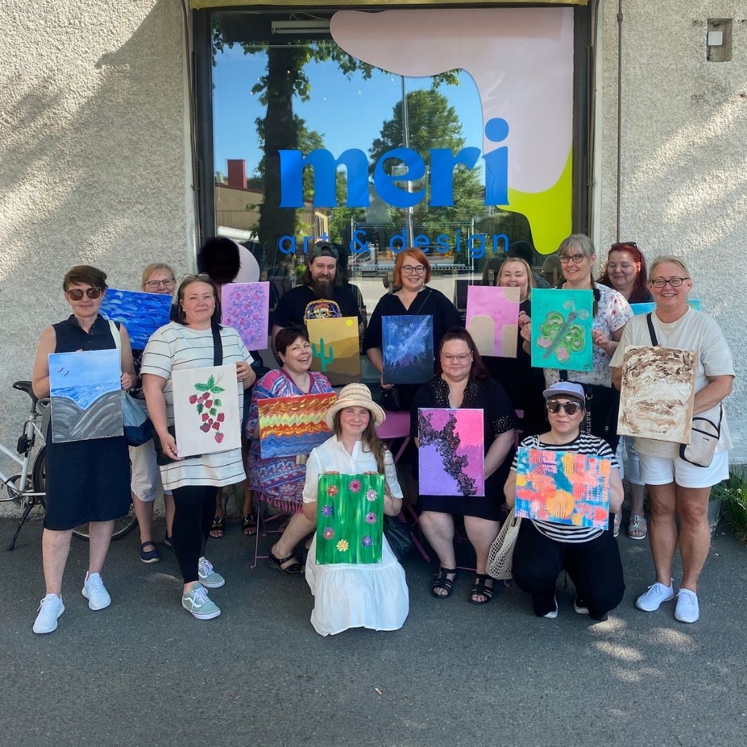 Maalaustarvikkeita riittää max 30 hlö ryhmille, mutta studiolla ryhmäkoko rajoittuu max 16 henkilöön. Olemme pitäneet maalauspajoja asiakkaiden omissa tiloissa (kotona, kesämökillä, firman kahvihuoneessa, neukkareissa). Vaihtoehtona on myös vuokratilat, joiden varaamisesta vastaa asiakas. Studion ulkopuolella pidettävistä yksityistilaisuuksista perimme lisämaksun, joka määräytyy ryhmäkoon ja matkan mukaan (kysy lisää).